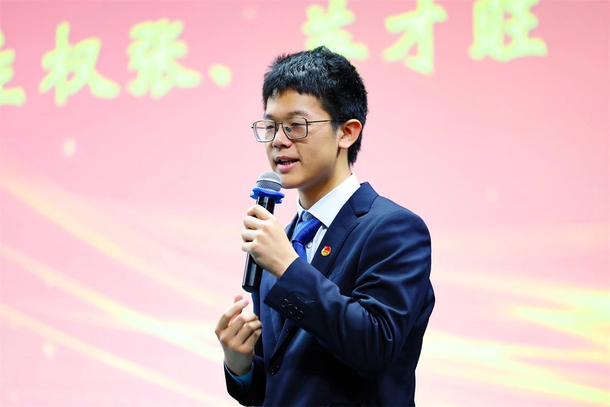 第一届“爱国荣校”青年学生宣讲团优秀代表王哲铭同学作了《从爱国青年到计算机泰斗》主题展示。他通过生动讲述1952届校友谭浩强教授的事迹,激励同学们传承爱国精神,勇担时代使命。